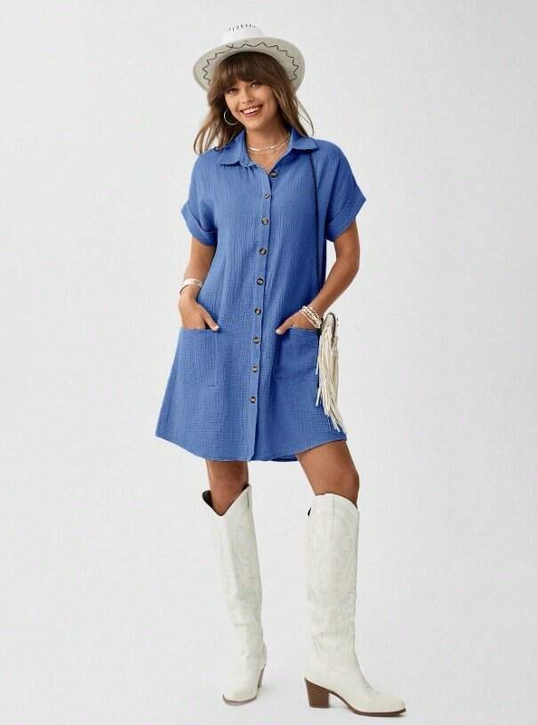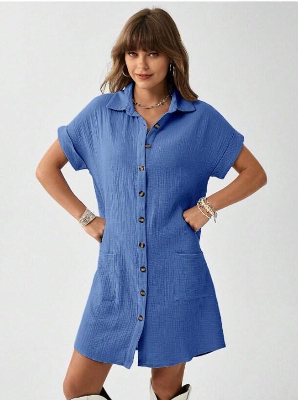 Kadın Cep Detay Müslin Kumaş Mini Gömlek Elbise