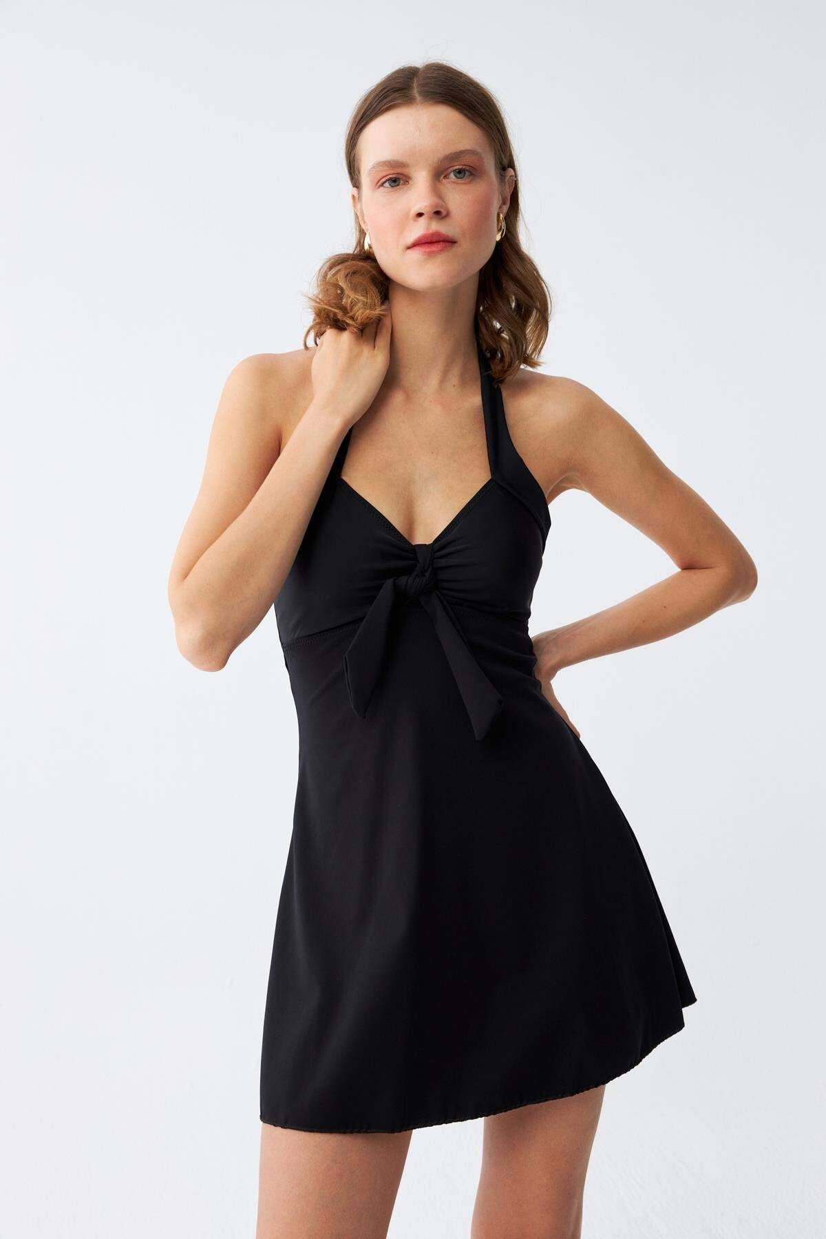 Akbeniz’in siyah renkli bu elbise mayo modeli, bağlama detaylı göğüs tasarımı ve boyundan bağlamalı askı stiliyle dikkat çekerken, sade ama etkileyici bir stil sunuyor. Vücuda oturan kesimiyle konforu ve şıklığı bir arada yaşayın.