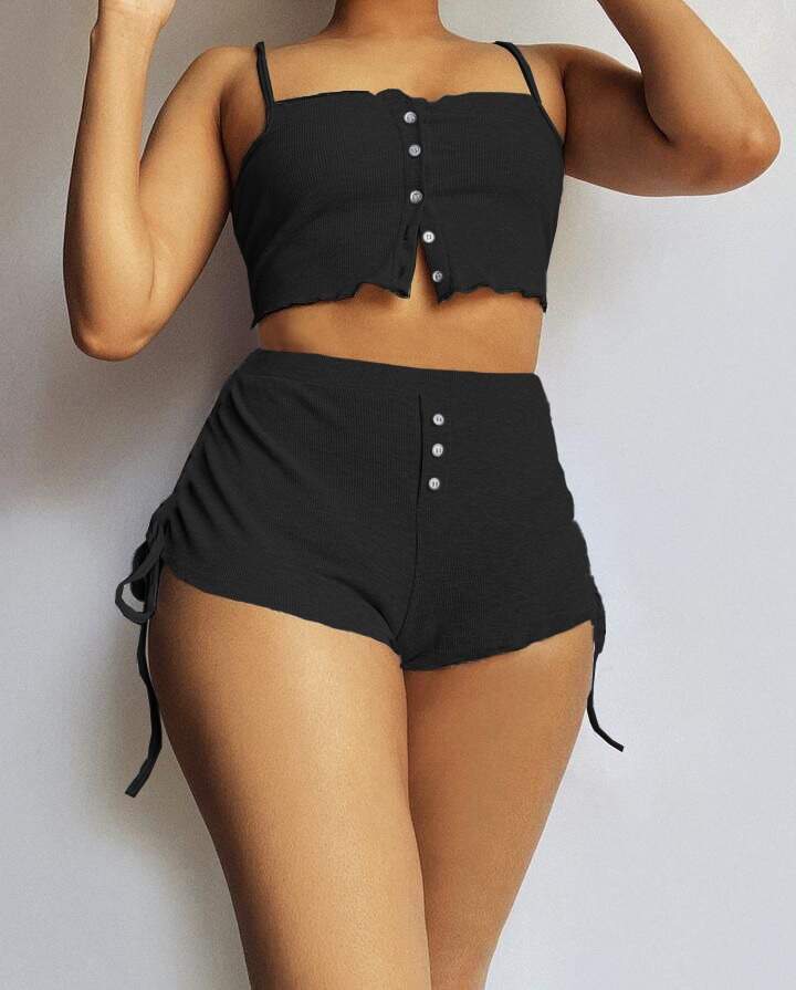 Kadın Ip Askılı Crop Bluz Ve Yanlardan Büzgülü Ikili Kaşkorse Short Takım