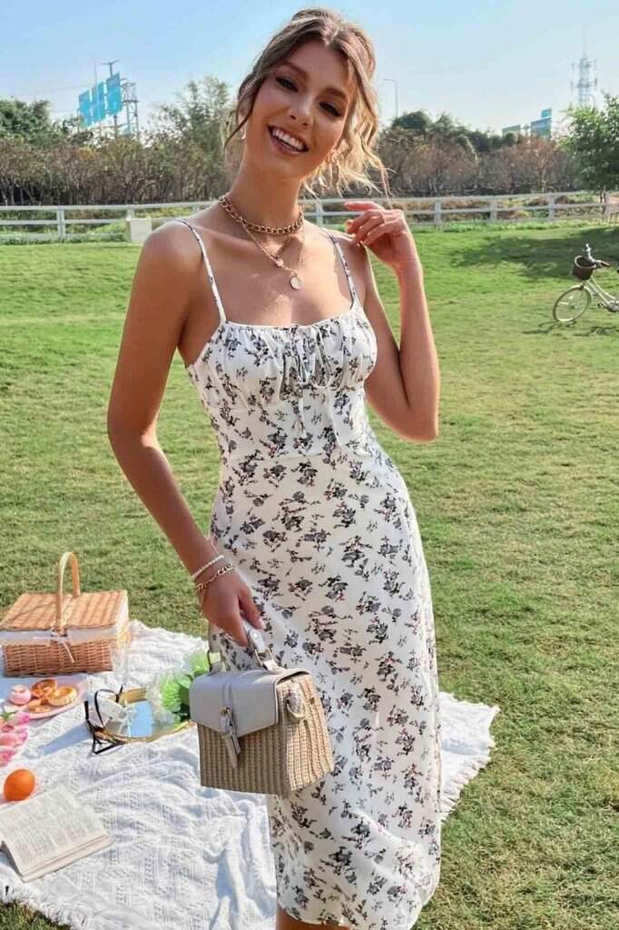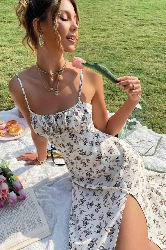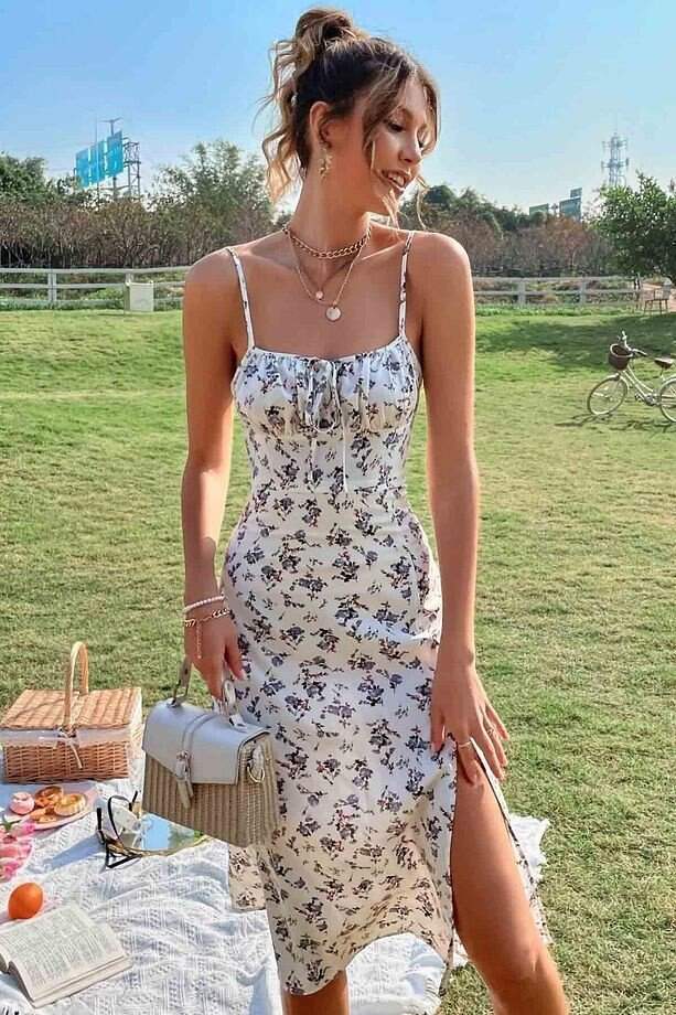 Kadın Ip Askılı Yakadan Bağcıklı Desenli Süprem Elbise