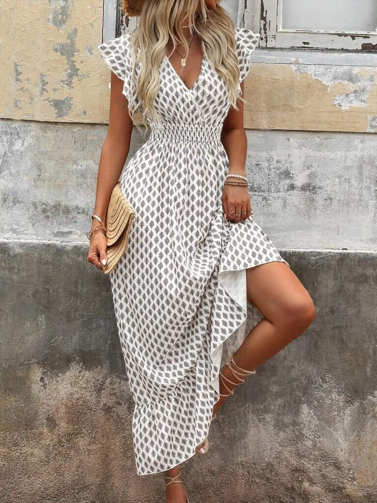 Kadın Kısa Kelebek Kollu Kruvaze Yakalı Desenli Süprem Elbise