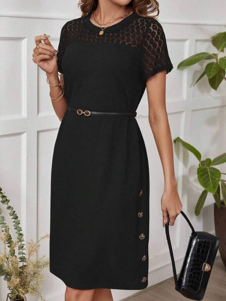 Kadın Kısa Kollu Bisiklet Yaka Dantel Detaylı Düğmeli Modal Elbise