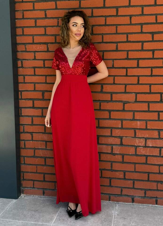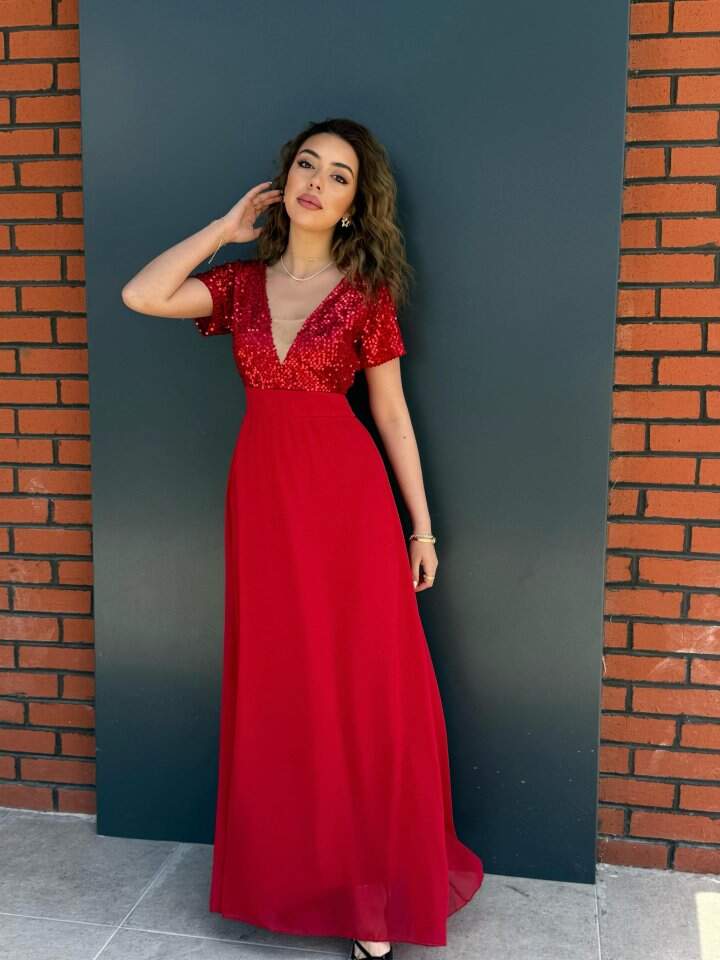 Kadın Kısa Kollu Derin V Yakalı A Kesim Pulpayet Detaylı şifon Nedime Elbisesi