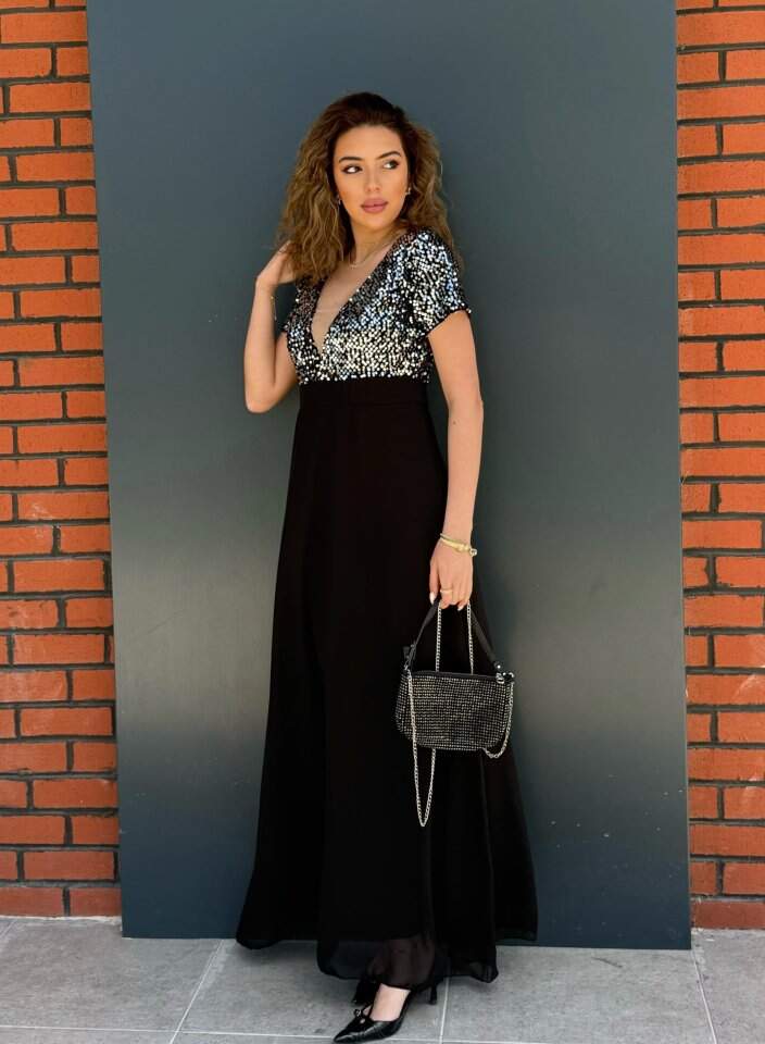 Kadın Kısa Kollu Derin V Yakalı A Kesim Pulpayet Detaylı şifon Nedime Elbisesi