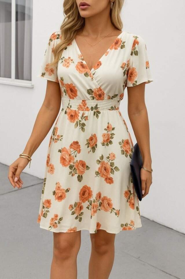 Kadın Kısa Kollu Kruvaze Yakalı Desenli Süprem Kısa Elbise