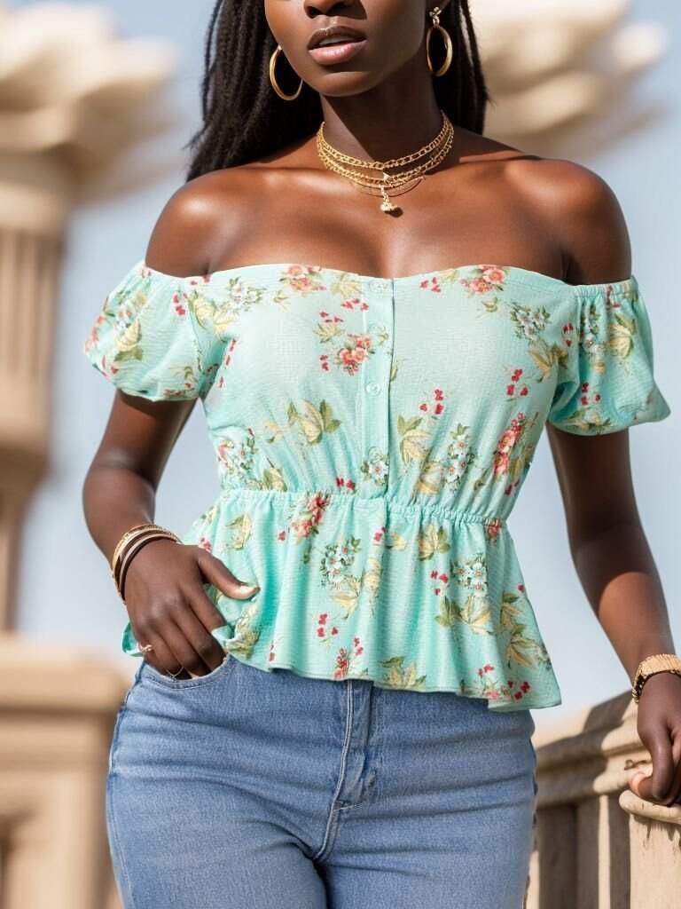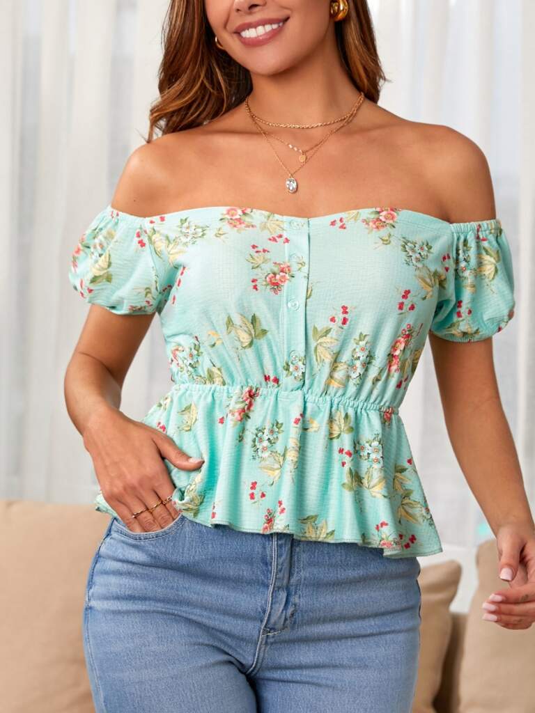 Kadın Kısa Kollu Madonna Yaka çiçek Desenli Düğme Detay Gipeli Süprem Kumaş Bluz