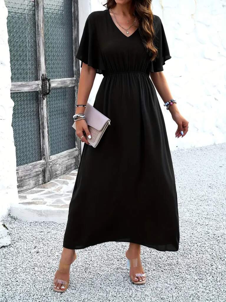 Kadın Kısa Kollu V Yakalı Beli Lastikli Uzun Viskon Elbise