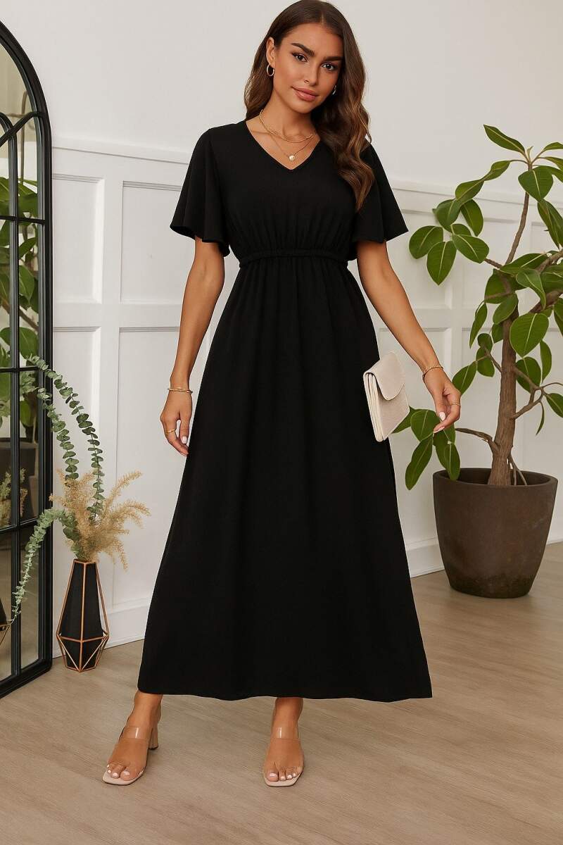 Kadın Kısa Kollu V Yakalı Beli Lastikli Uzun Viskon Elbise
