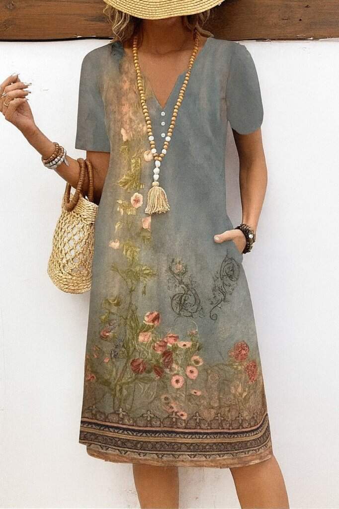 Kadın Kısa Kollu V Yakalı Desenli Süprem Elbise