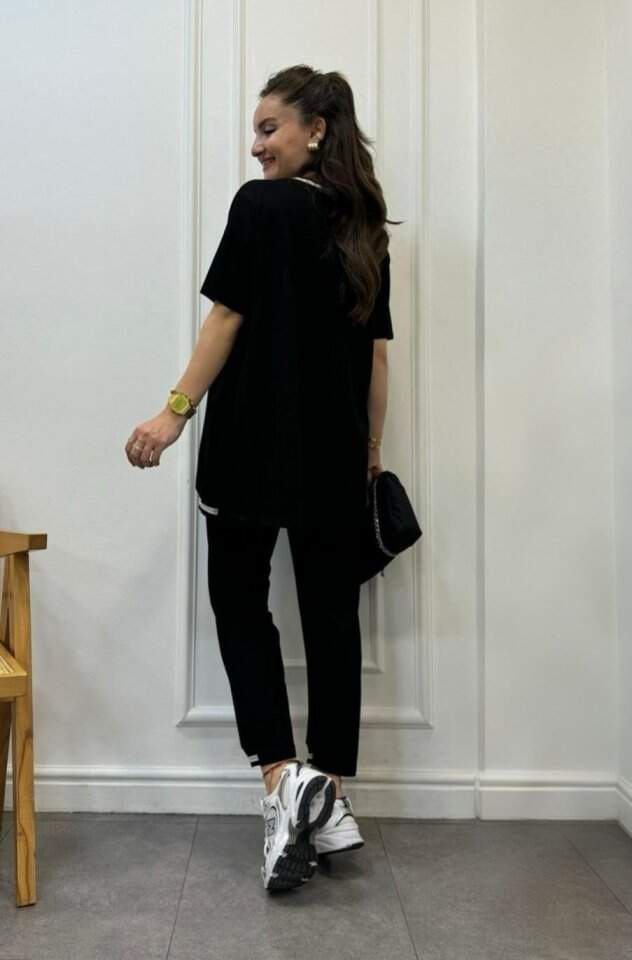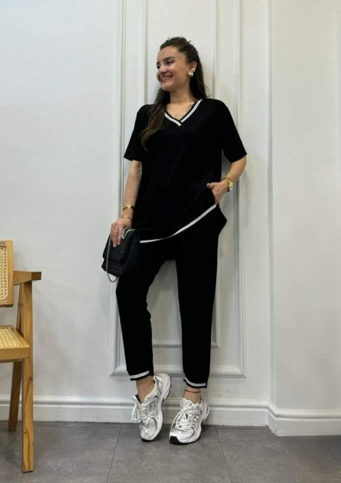 Kadın Kısa Kollu V Yakalı Iki Iplik Bluz Ve Pantolon Ikili Takım