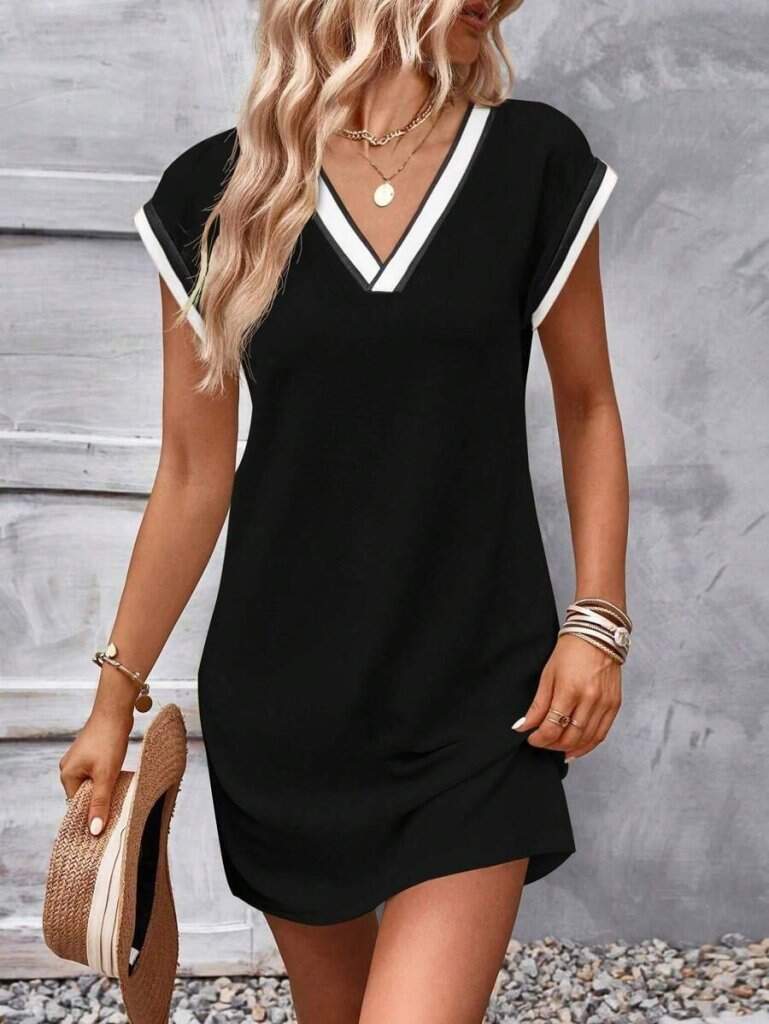 Kadın Kısa Kollu V Yakalı Ribanalı Modal Mini Elbise