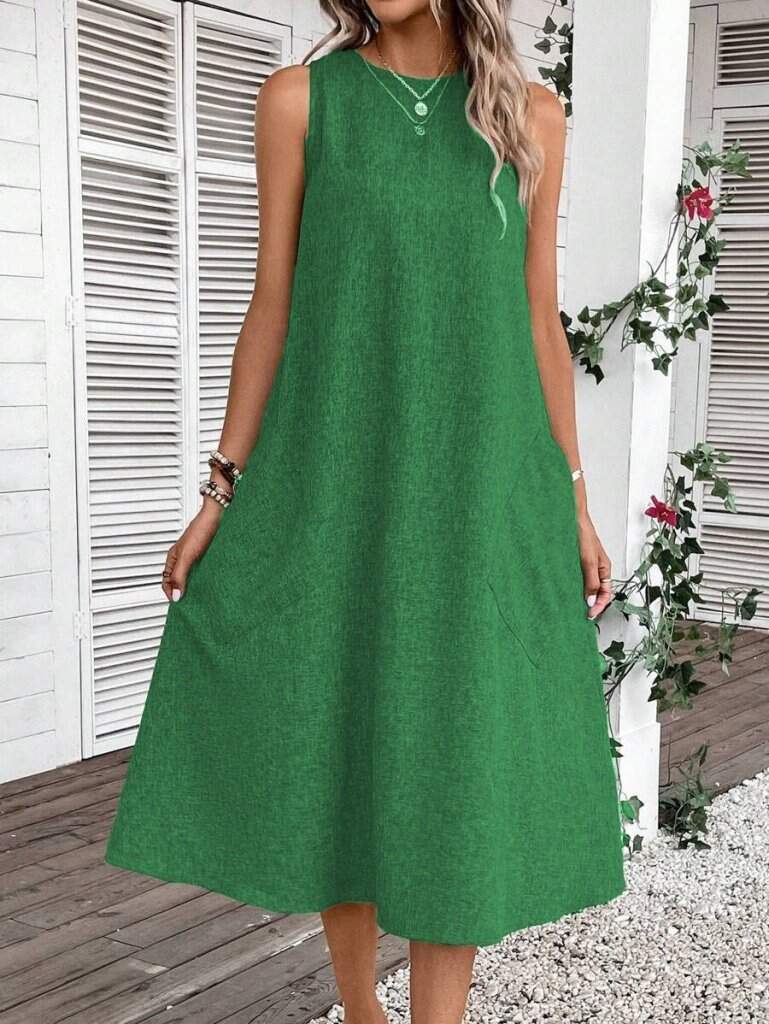Kadın Kolsuz Bisiklet Yaka Cepli Midi Keten Elbise