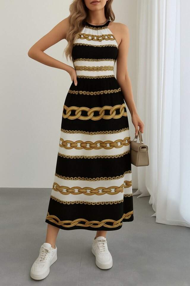 Kadın Kolsuz Boyundan Bağlamalı Beli Lastikli Dijital Baskı Süprem Uzun Elbise