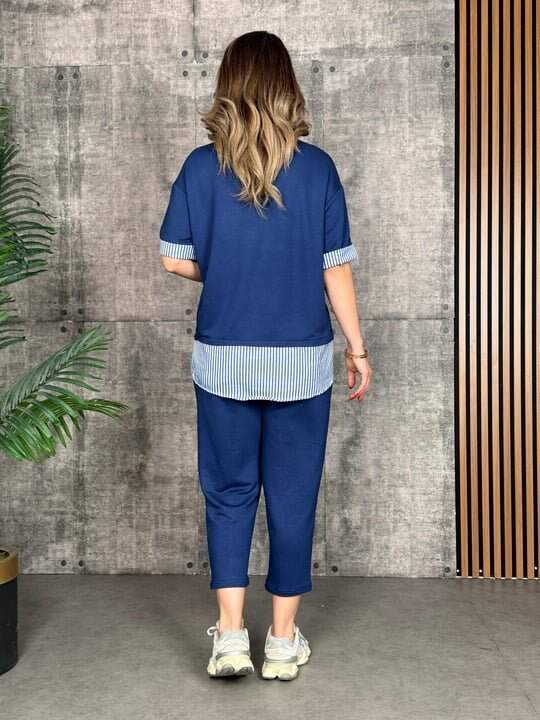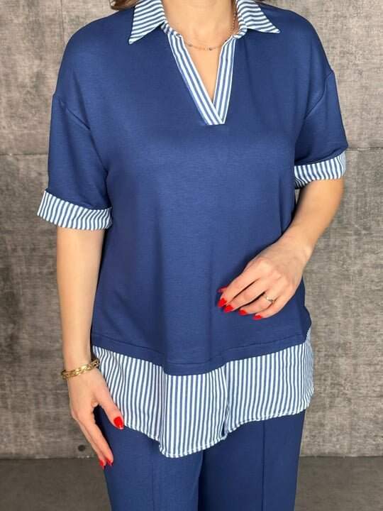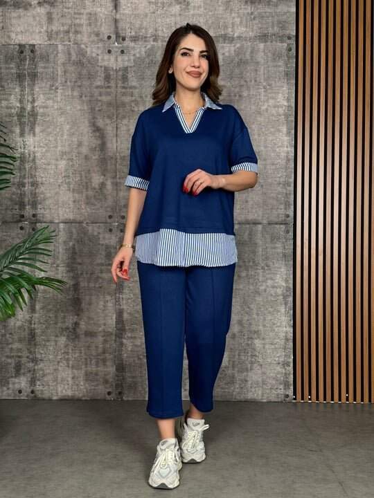 Kadın Modal Kumaş çizgili Gömlek Yaka Ikili Takım