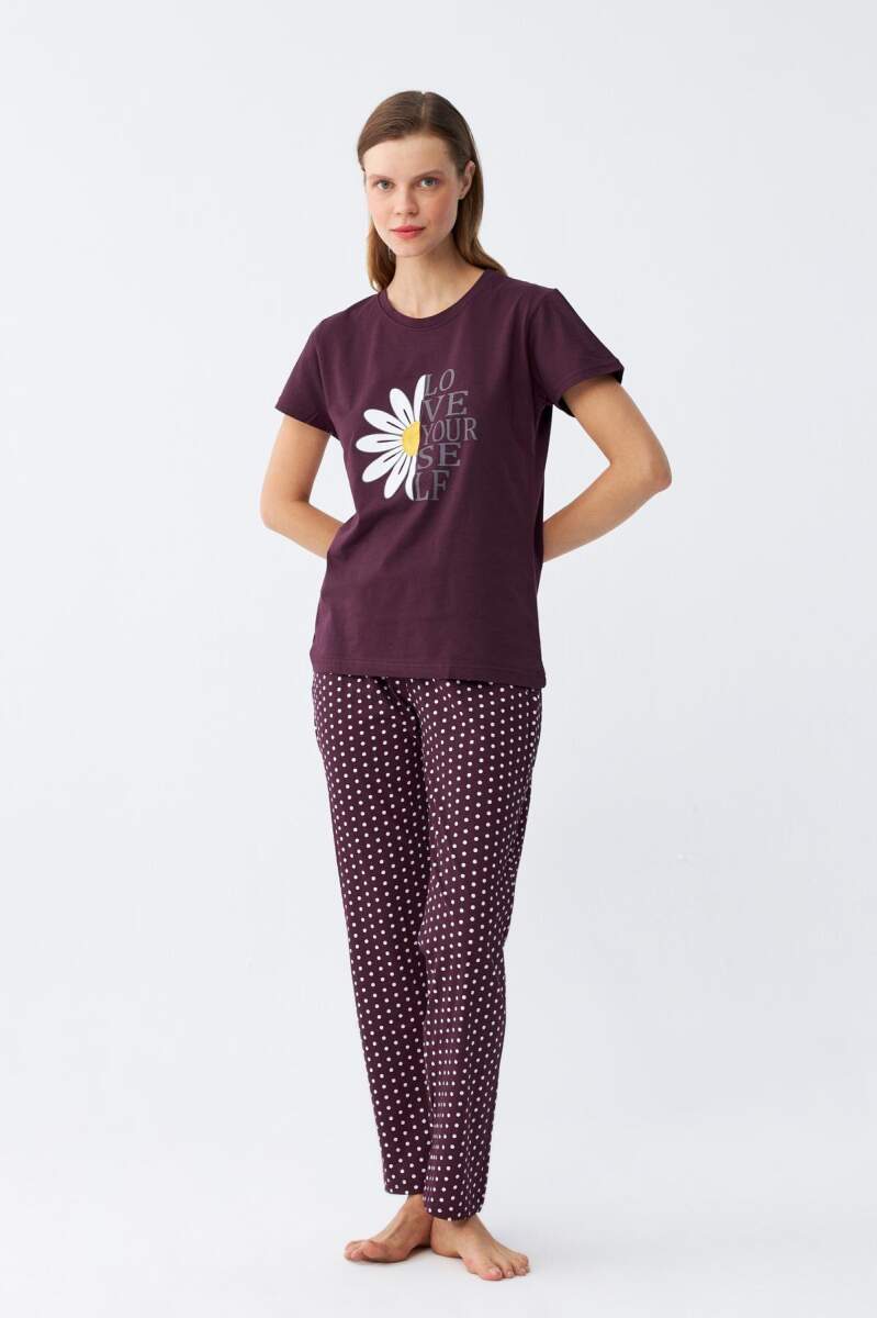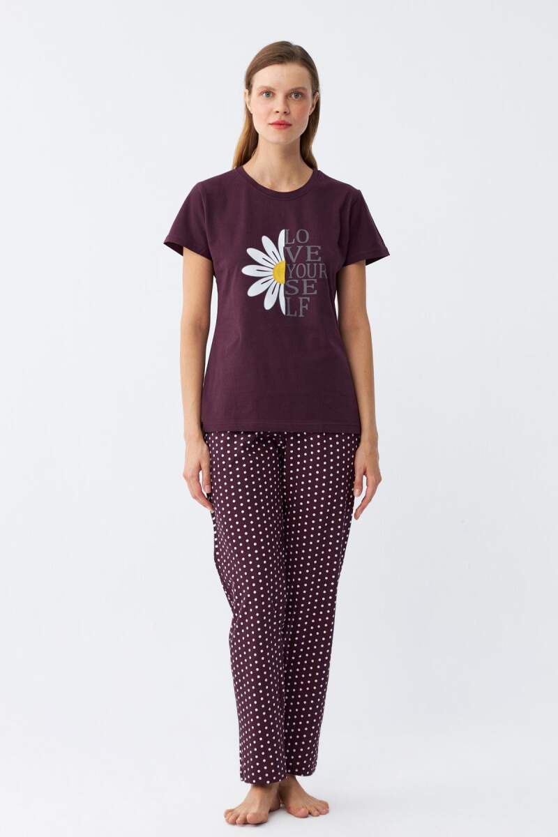 Mürdüm tonlarının enerjisiyle tasarlanan bu takım, ön kısmındaki “Love Yourself” mesajı ve zarif papatya baskısıyla hem şık hem motive edici. %100 pamuk kumaşıyla rahat bir uyku seni bekliyor.