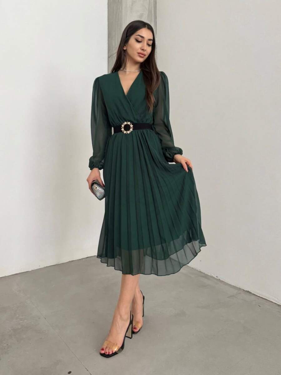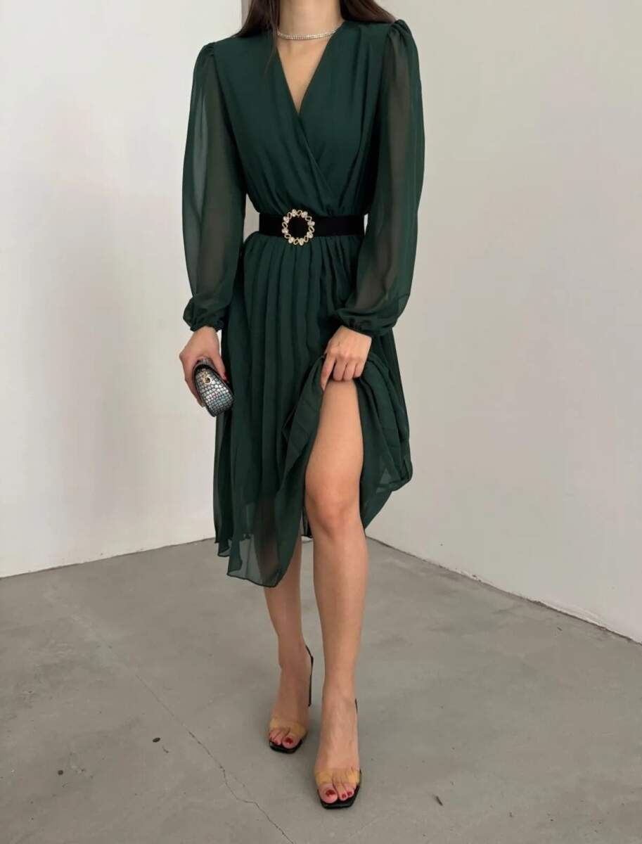 Kadın şifon Kumaş Astalı Kloş Kesim Kruvaze Yaka Midi Boy Elbise