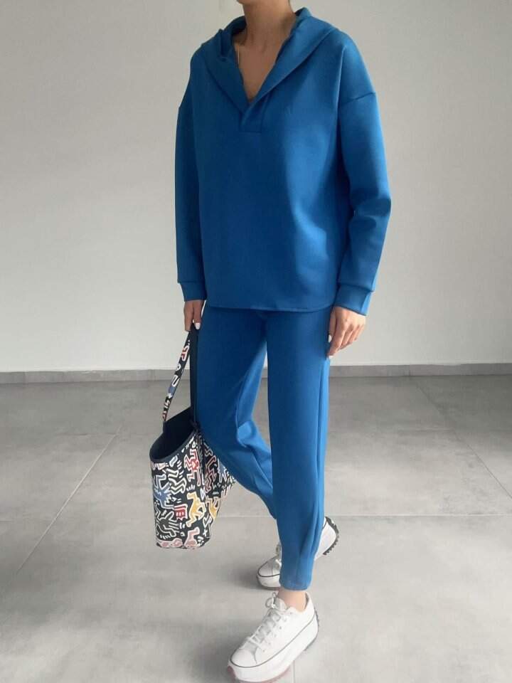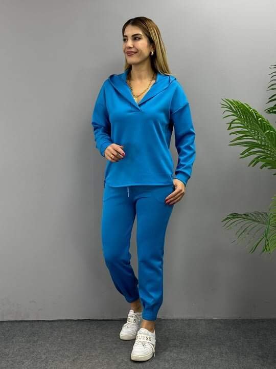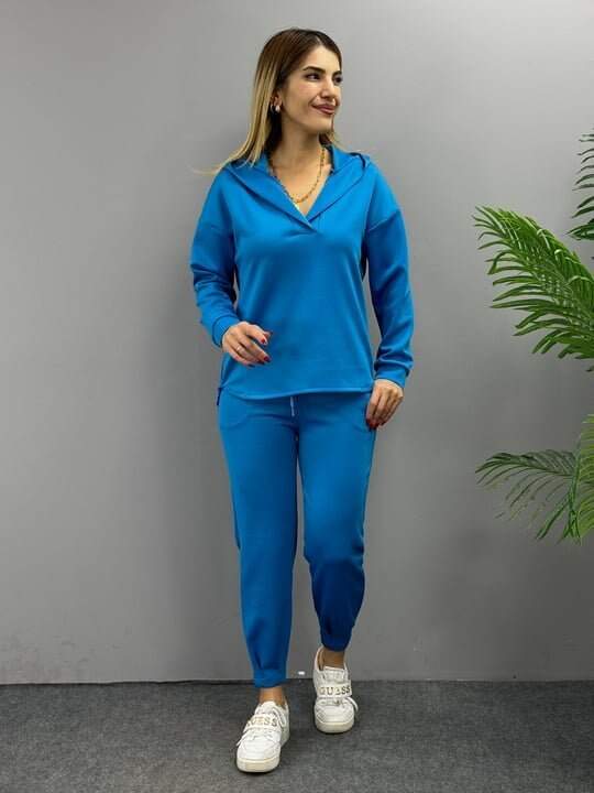 Kadın Uzun Kol V Yaka Kapüşon Detay Sweat Ve Yüksel Bel Eşofman Ikili Takım