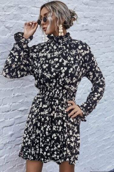 Kadın Uzun Kollu Balıkçı Yaka çiçek Baskılı Helen Kumaş Elbise