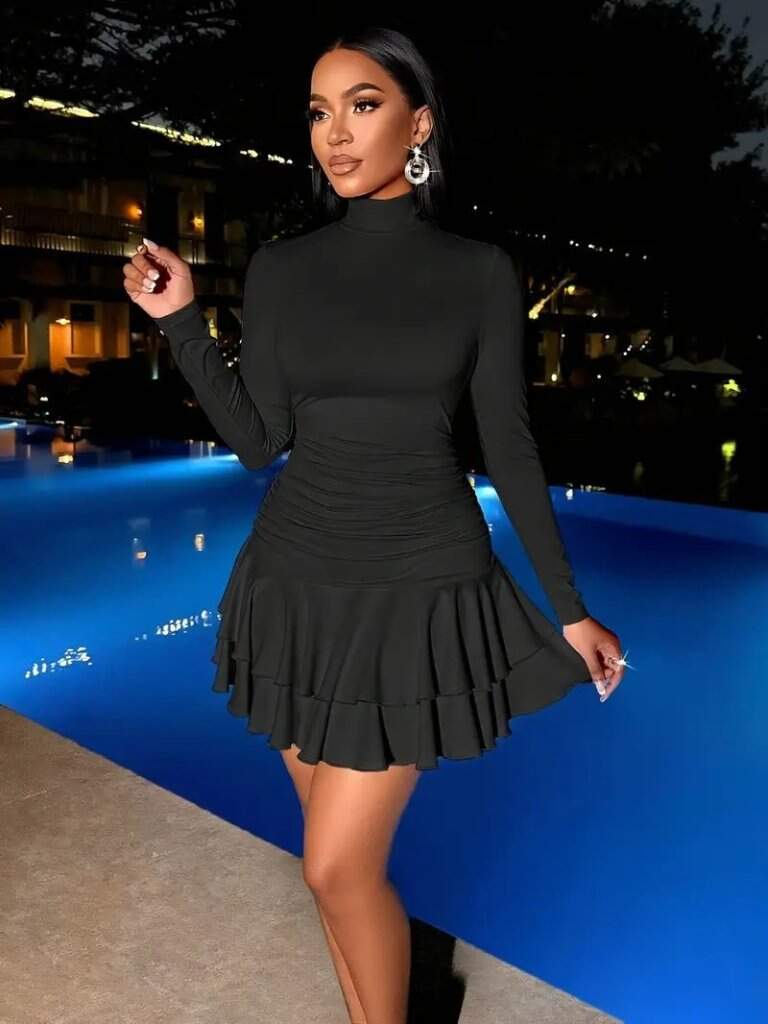 Kadın Uzun Kollu Balıkçı Yaka Mini Fırfırlı Sandy Elbise