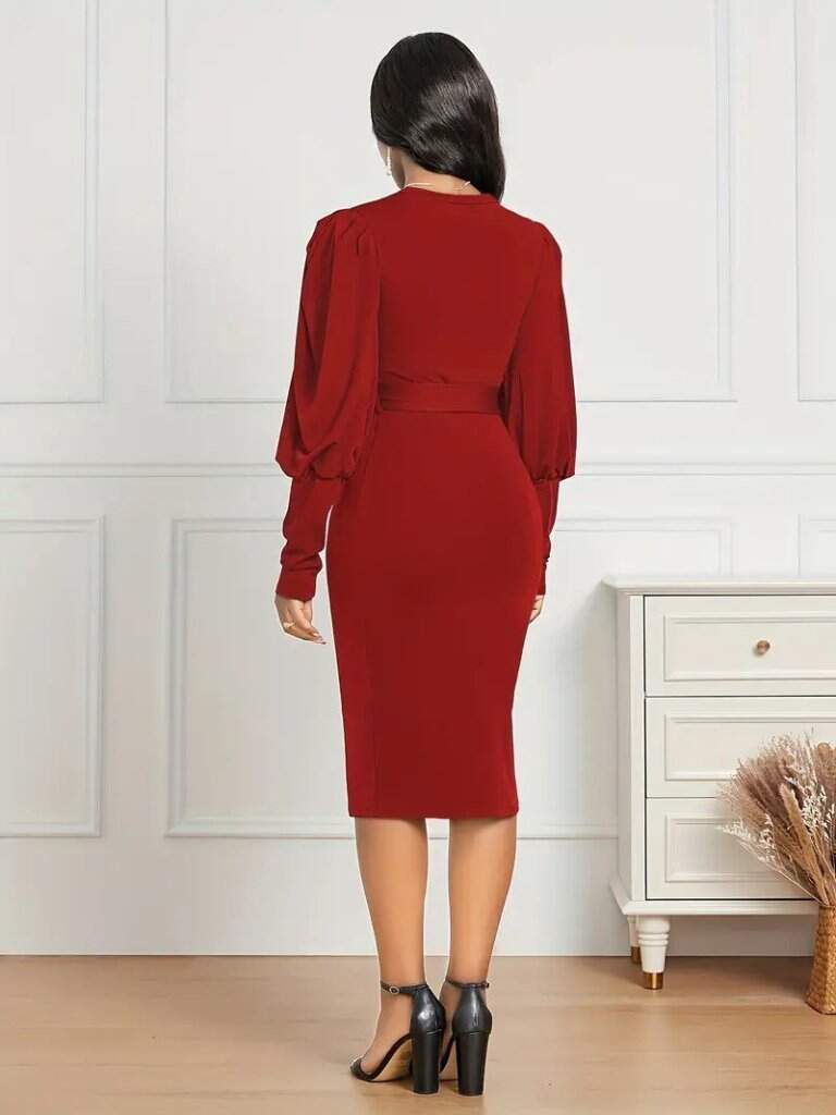 Kadın Uzun Kollu Bisiklet Yaka Beli Kuşaklı Ithal Krep Midi Elbise
