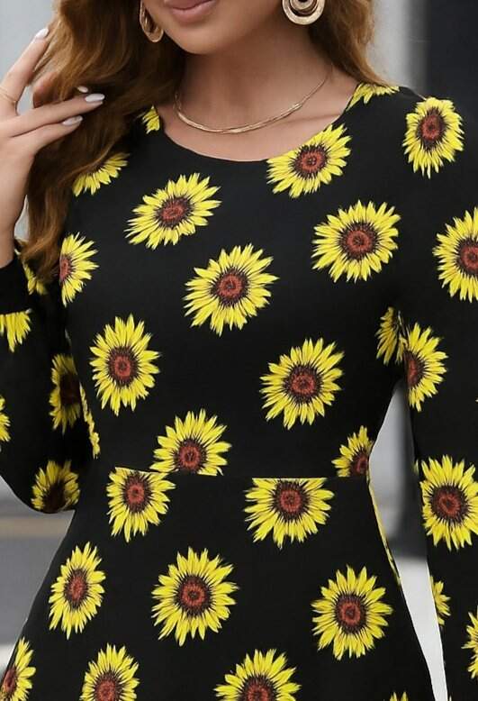 Kadın Uzun Kollu Bisiklet Yaka Desenli Kısa Krep Elbise