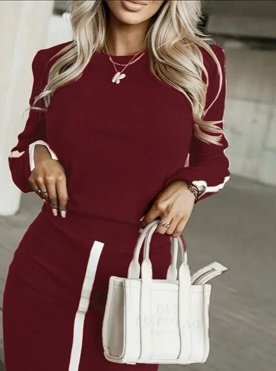 Kadın Uzun Kollu Bisiklet Yaka Kaşkorse Bluz Ve Yırtmaçlı Etek Ikili Takım