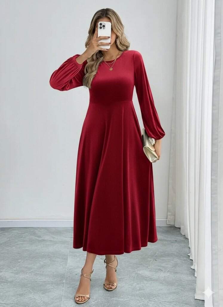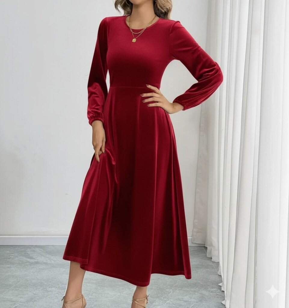 Kadın Uzun Kollu Bisiklet Yaka Midi Kadife Elbise