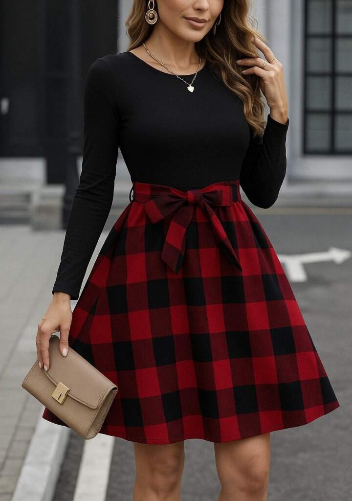 Kadın Uzun Kollu Bisiklet Yaka üst Viskon Alt Ekose Kısa Elbise