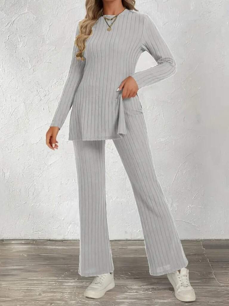 Kadın Uzun Kollu Bisiklet Yaka Yandan Yırtmaçlı şardonlu Kaşkorse Bluz Ve Pantolon Ikili Takım