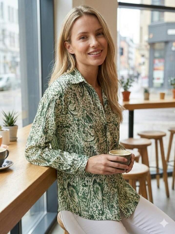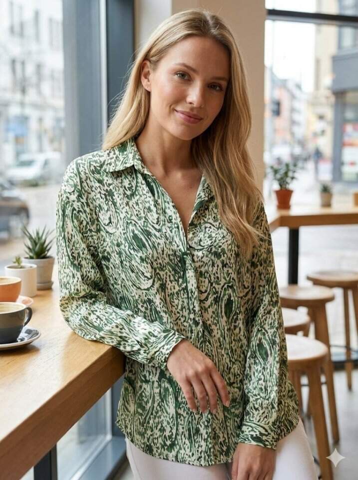 Kadın Uzun Kollu Dalgalı Desen Baskılı Gömlek
