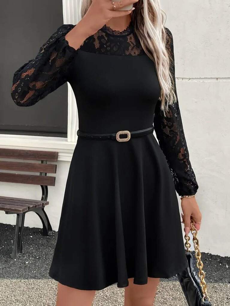 Kadın Uzun Kollu Dantelli Kloş Mini Ithal Krep Elbise
