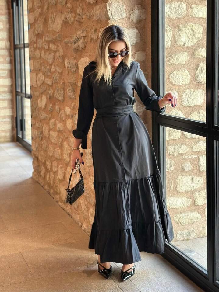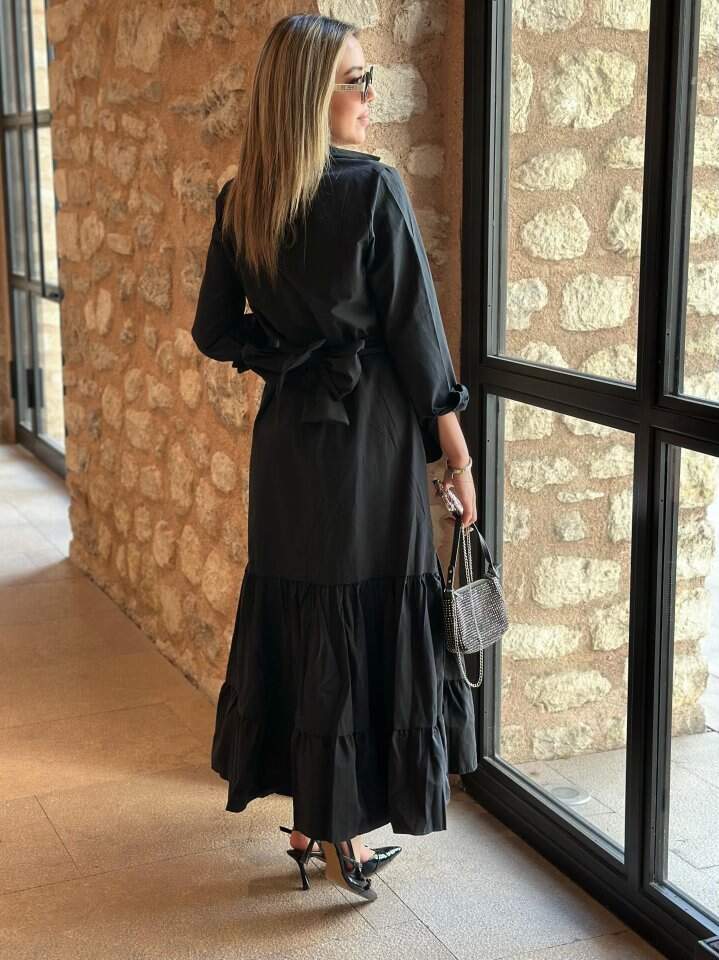 Kadın Uzun Kollu Eteği Fırfırlı Beli Kuşaklı Trikoton Tam Boy Gömlek Elbise