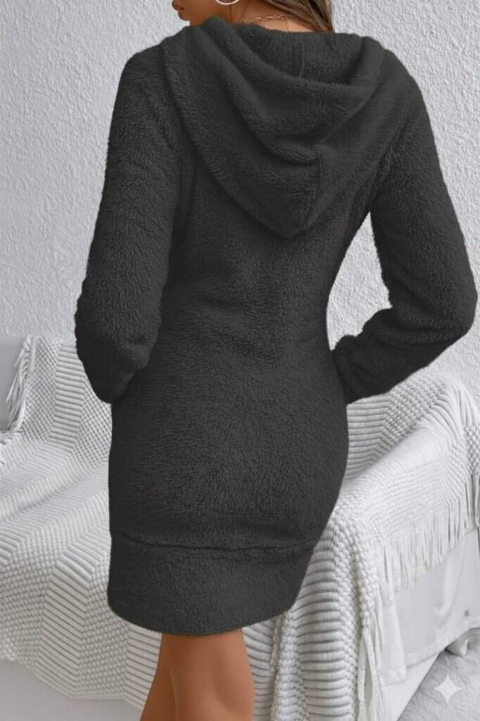 Kadın Uzun Kollu Kapşonlu Cepli Mini Peluş Elbise