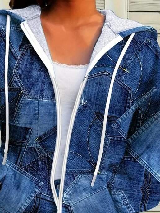 Kadın Uzun Kollu Kapşonlu Fermuarlı Kot Desenli Bağcıklı Modal Ceket