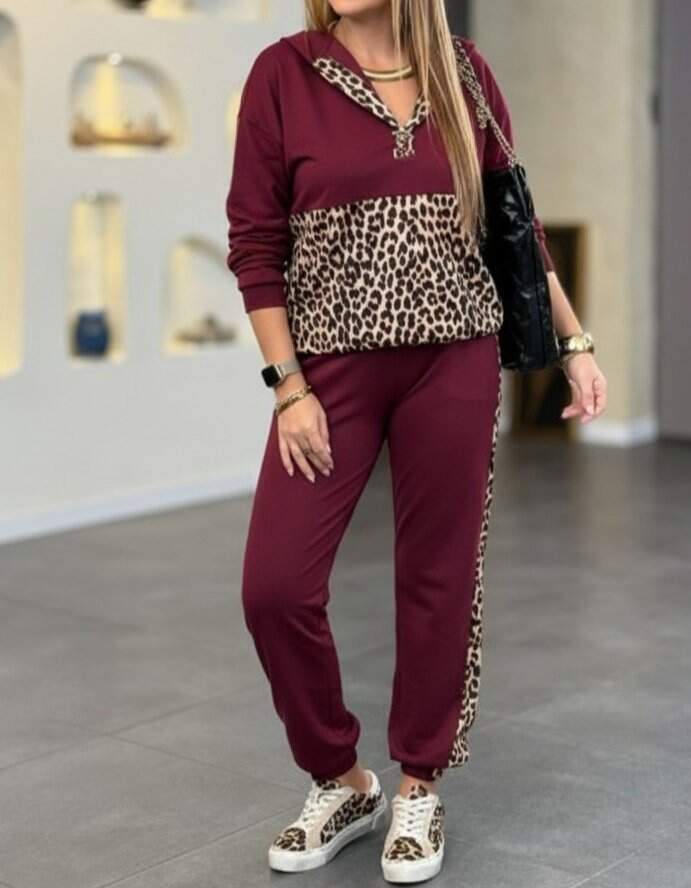 Kadın Uzun Kollu Kapşonlu Leopar Desen Detaylı Viskon Iki Iplik Bluz Ve Pantolon Ikili Takım