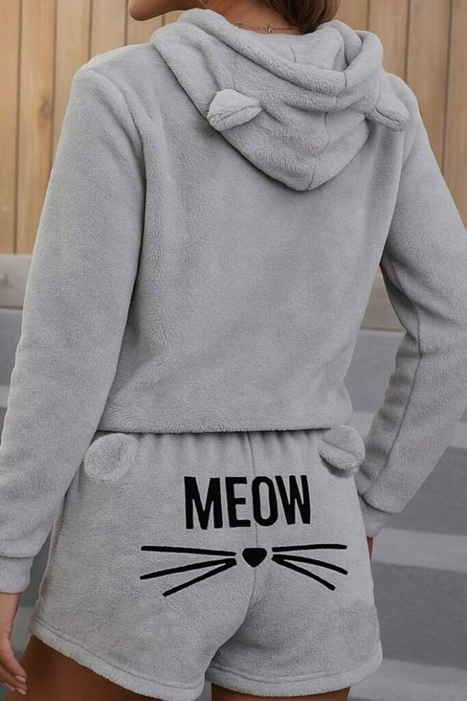 Kadın Uzun Kollu Kapşonlu Peluş Bluz Ve Kısa Short Ikili Takım
