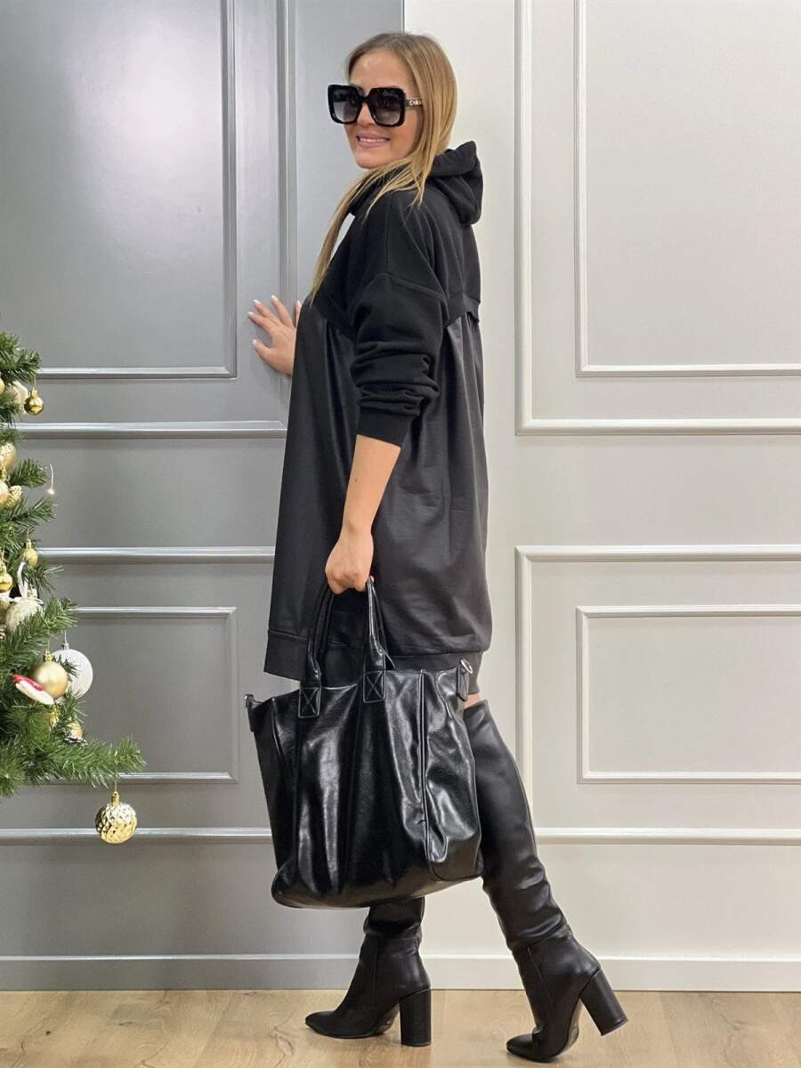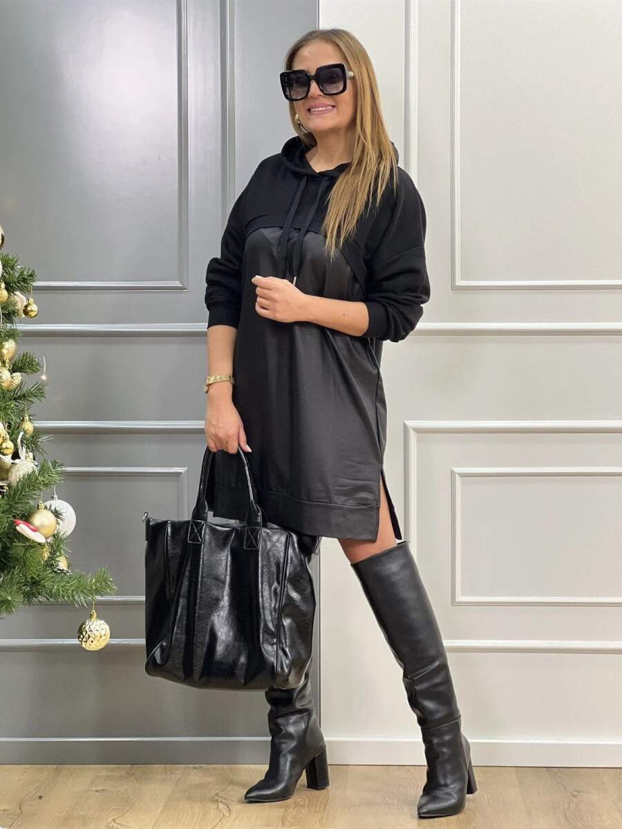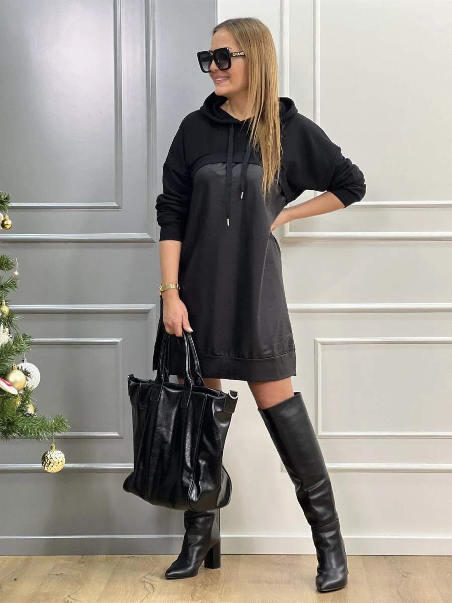 Kadın Uzun Kollu Kapüşon Ve Deri Detay Diz üstü Elbise