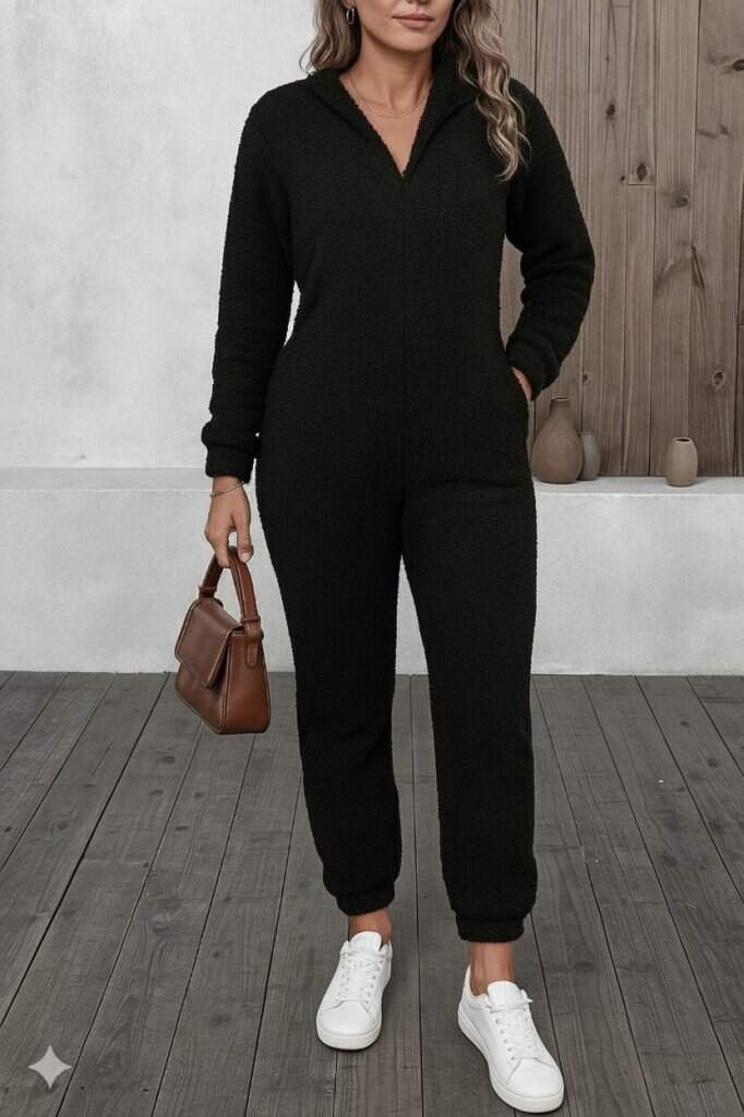 Kadın Uzun Kollu Kapüşonlu Tavşan Kulak Detaylı Peluş Tulum
