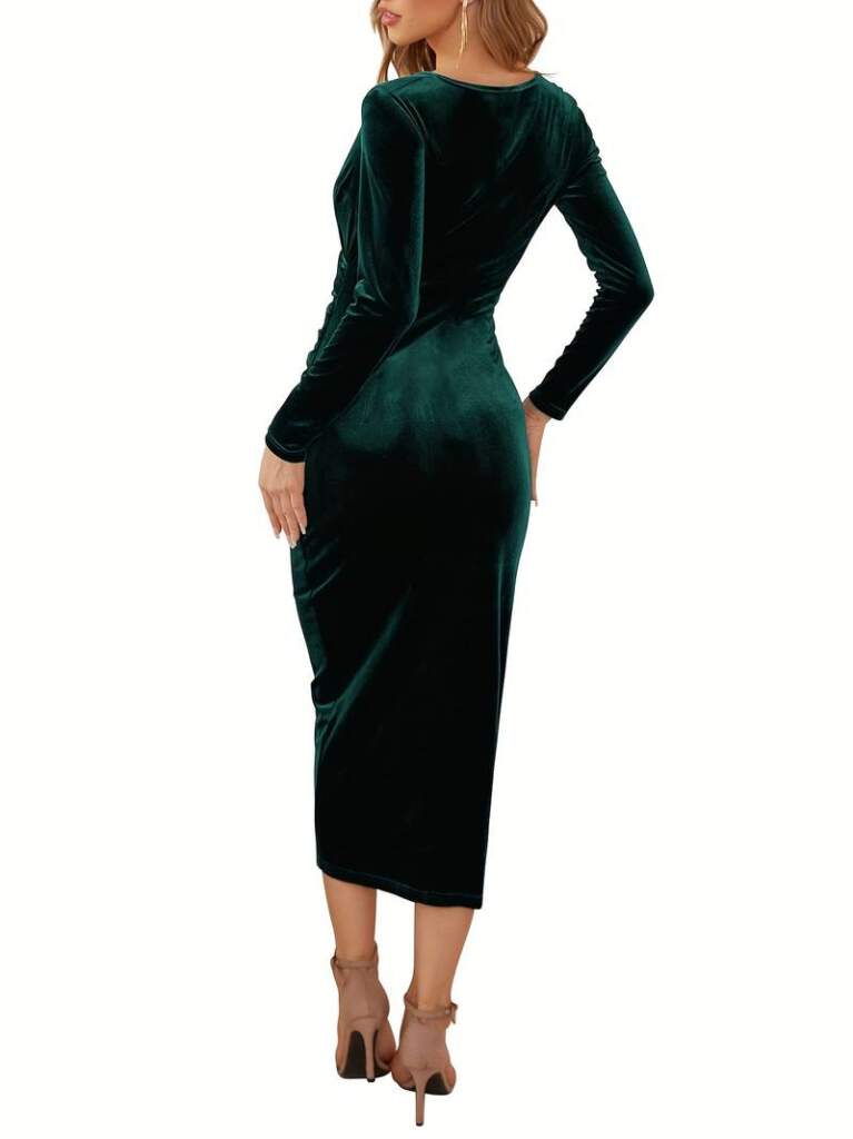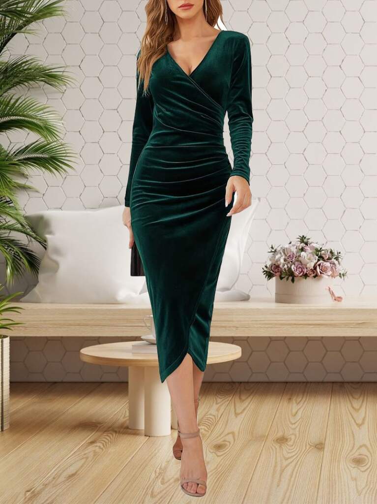Kadın Uzun Kollu Kruvaze Yaka Belden Büzgü Detay Midi Kadife Elbise