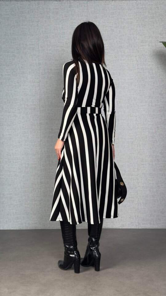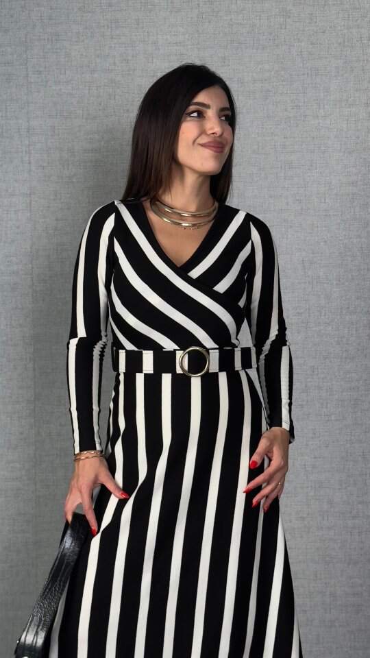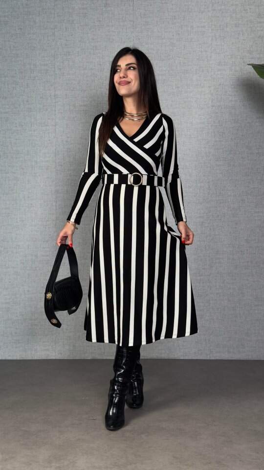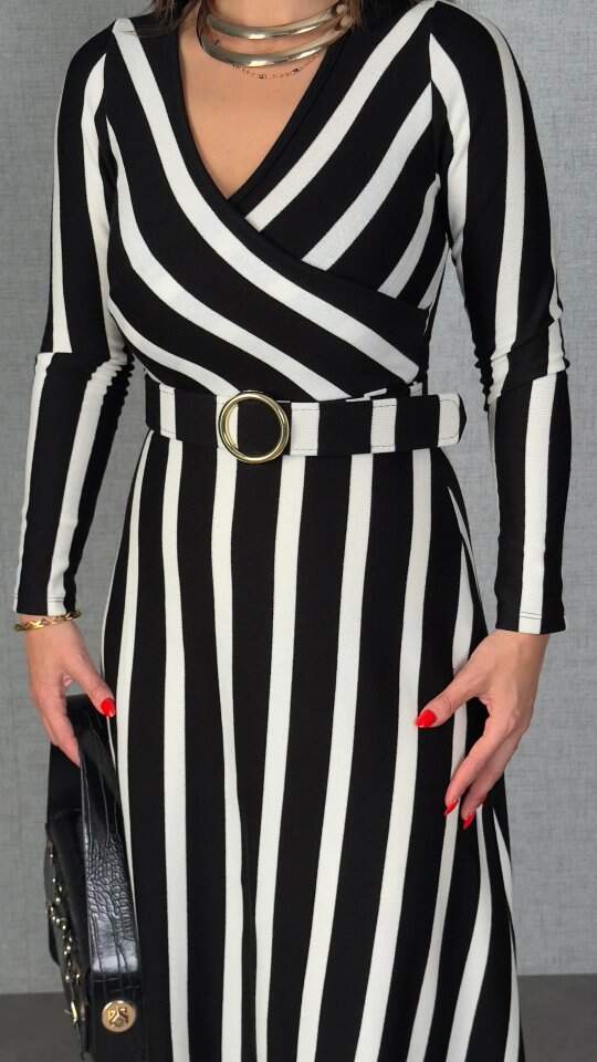 Kadın Uzun Kollu Kruvaze Yaka Kemer Dahil çizgili Triko Elbise