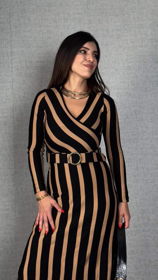 Kadın Uzun Kollu Kruvaze Yaka Kemer Dahil çizgili Triko Elbise