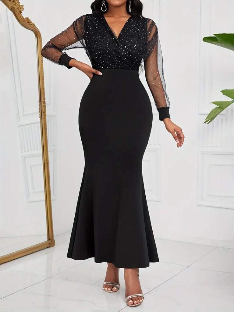 Kadın Uzun Kollu Kruvaze Yakalı Taş Ve Tül Detaylı Uzun Ithal Krep Elbise