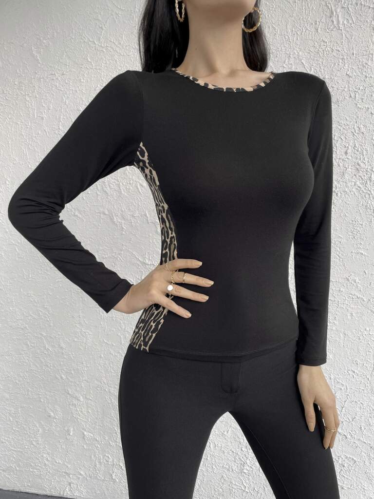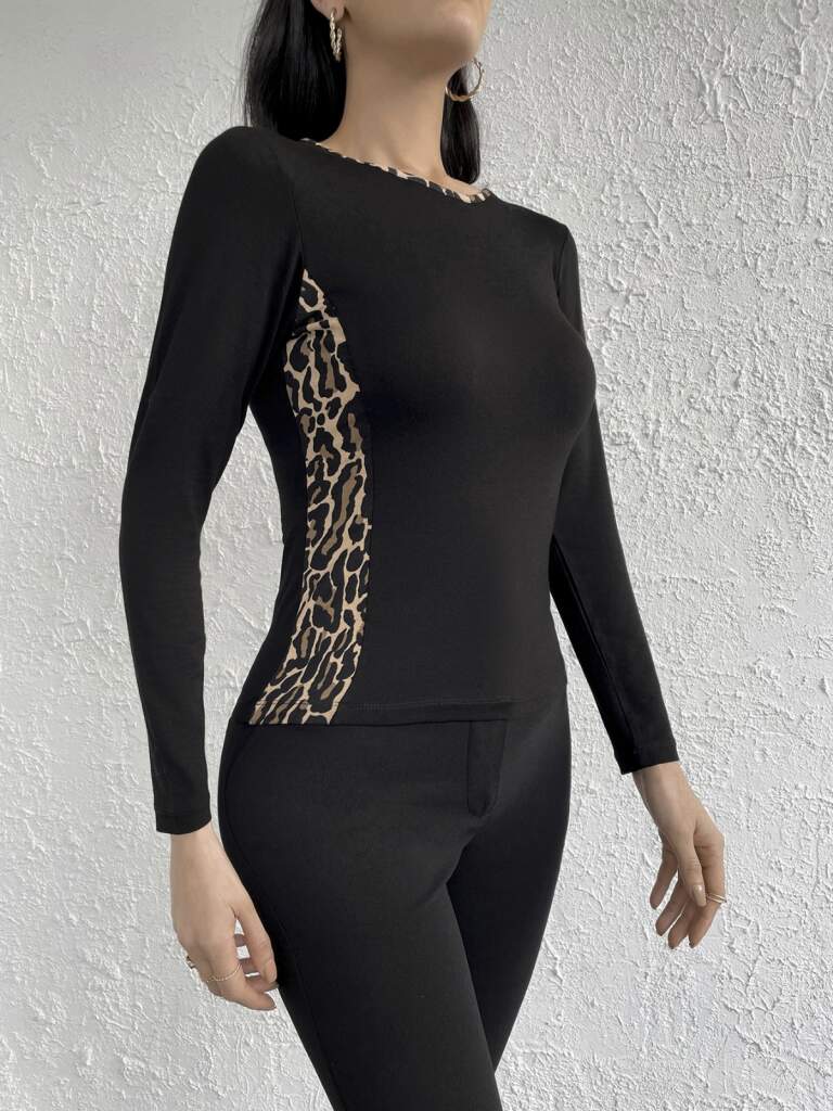 Kadın Uzun Kollu Leopar şeritli Viskon Bluz