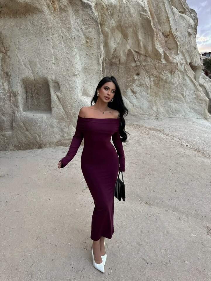 Kadın Uzun Kollu Madonna Yaka Midi Boy Elbise