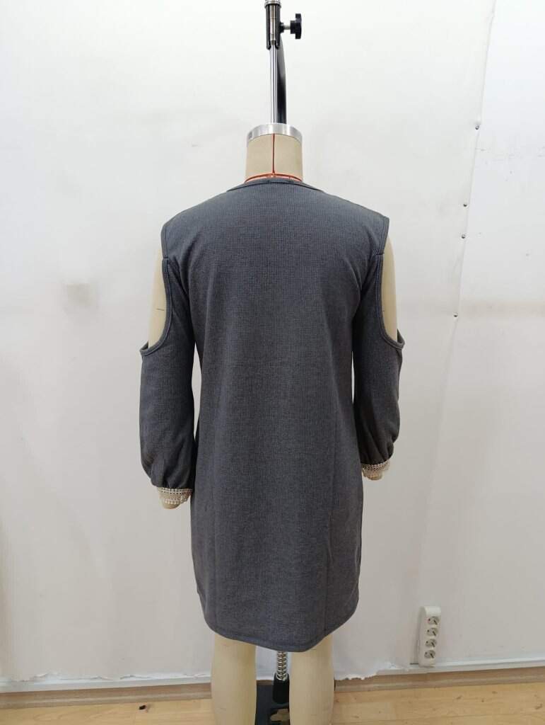 Kadın Uzun Kollu Omuzdan Açık V Dantel Yakalı Mini Waffle Elbise