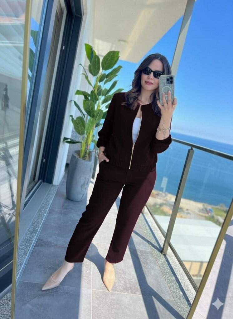 Kadın Uzun Kollu önden Fermuarlı Modal Ceket Ve Pantolon Ikili Takım