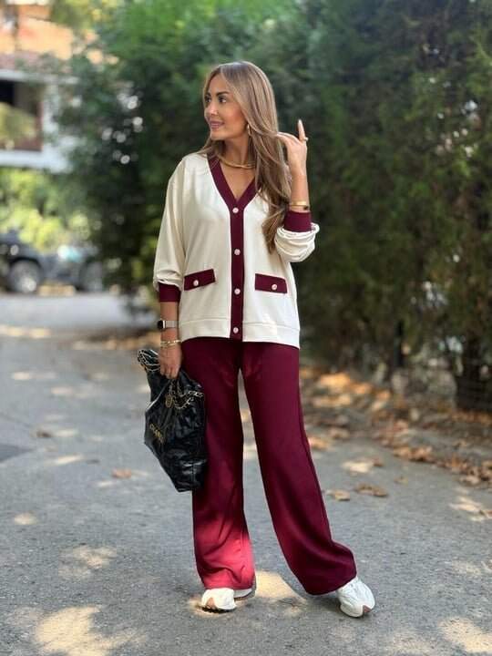 Kadın Uzun Kollu Ribanali Cep Detay Hırka Ve Bol Paça Pantolon Ikili Takım