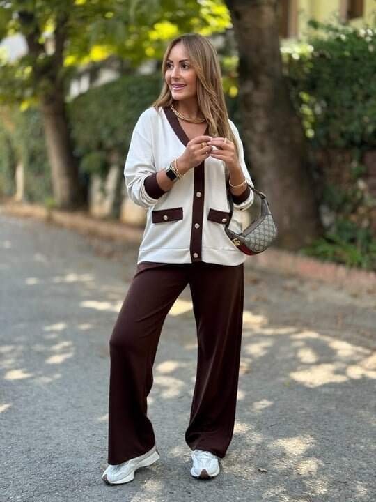 Kadın Uzun Kollu Ribanali Cep Detay Hırka Ve Bol Paça Pantolon Ikili Takım