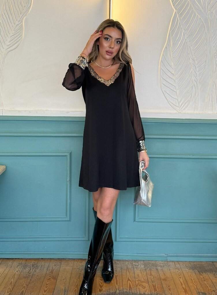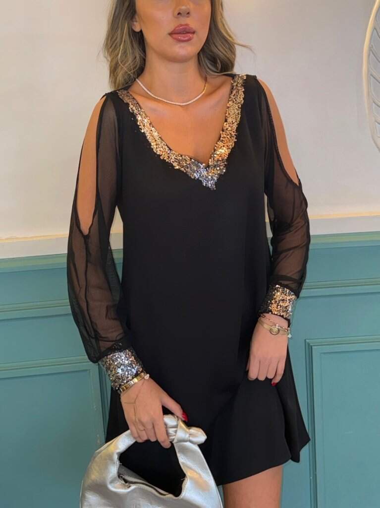 Kadın Uzun Kollu V Yaka Kollar Tül Yırtmaç Detay Kol Manşetleri Ve Yaka Payet Krep Elbise