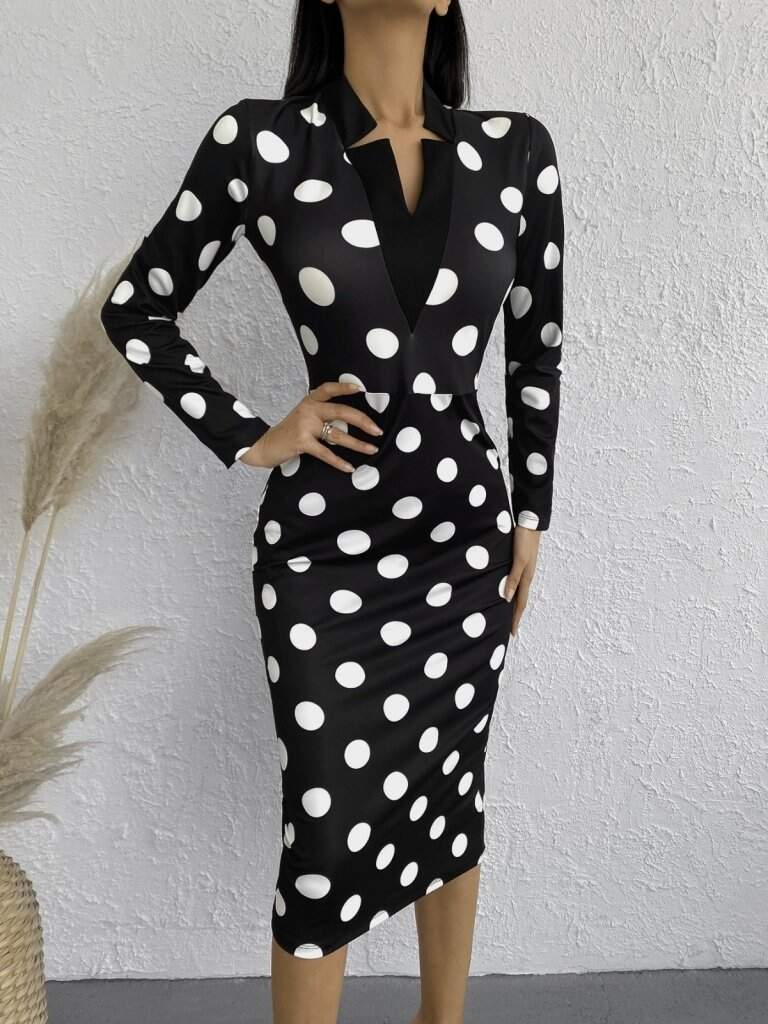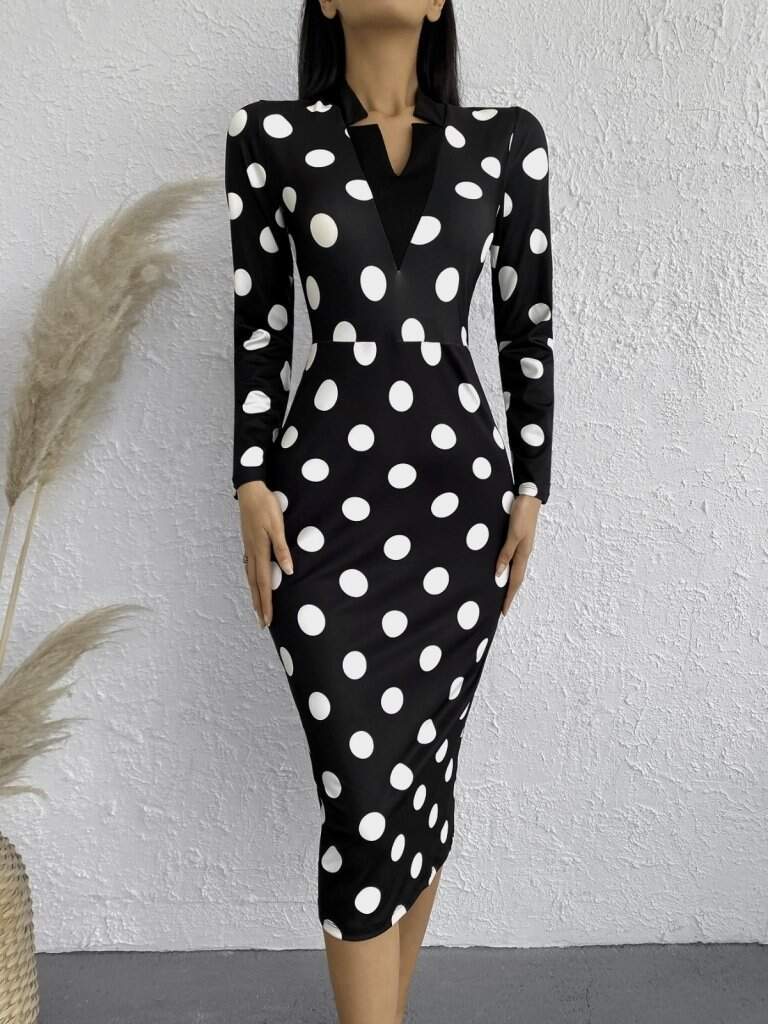 Kadın Uzun Kollu V Yaka Puantiyeli Krep Midi Boy Elbise